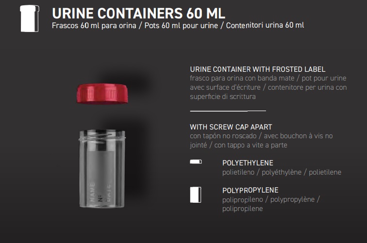 150 and 200 ml PP urine cups with screw cap. Non sterile cups have a blue screw cap and are sold in multi-packs. Sterile cups have a red screw cap and a satinized marking area and are individually wrapped.